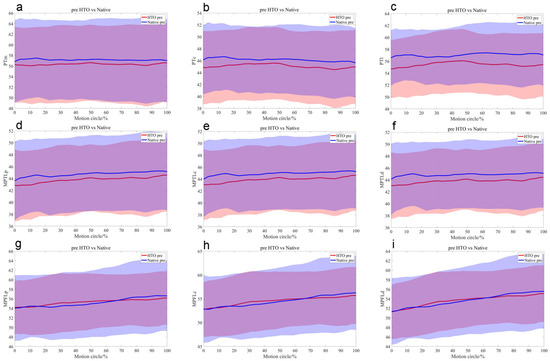 The mean length differences in the medial (a), central (b), and lateral (c) portions of the PT; the proximal (d), central (e), and distal (f) portions of the MPTL; and the proximal (g), central (h), and distal (i) portions of the MPFL during the stair-climbing motion with their standard deviations depicted using same-colour shading between the native (blue) and HTO (red) knees before surgery.