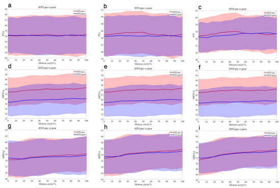 The mean length differences in the medial (a), central (b), and lateral (c) portions of the PT; the proximal (d), central (e), and distal (f) portions of the MPTL; and the proximal (g), central (h), and distal (i) portions of the MPFL during the stair-climbing motion with their standard deviations depicted using same-colour shading before (red) and after (blue) OWHTO.