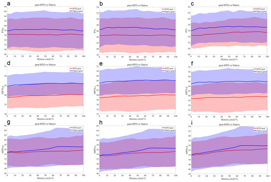 The mean length differences in the medial (a), central (b), and lateral (c) portions of the PT; the proximal (d), central (e), and distal (f) portions of the MPTL; and the proximal (g), central (h), and distal (i) portions of the MPFL during the stair-climbing motion with their standard deviations depicted using same-colour shading between native (blue) and HTO (red) knees after surgery.