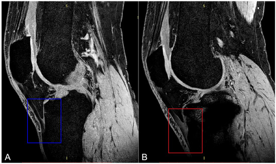One of 15 patients’ knee MR images was randomly selected to display the typical changes happening in distal PT bundles at 6 months after OWHTO ((A) preoperative MRI; (B) postoperative MRI).