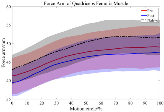 The quadriceps moment arm (QMA) could serve as a valid way to measure the moment quadriceps forces and patellofemoral compressive forces [18] during knee extension. The quadriceps muscle generates most of the force acting on the anterior knee. Osteotomy to change limb alignment is powerful to alter the direction of the quadriceps vector [19]. In addition, the patella functions like a lever and belongs to the extensor mechanism of the knee, where the patella could be considered a sesamoid bone, improving the efficiency by increasing the QMA to the center of rotation of the knee [20]. The patella provides a fulcrum for the quadriceps muscles, where they attach a knee extension moment. Abnormalities in the structure or position of the patella can significantly reduce the ability of the quadriceps to output torque, thereby affecting normal knee flexion and extension. Therefore, increasing the QMA could reduce quadriceps tension and patellofemoral compressive forces. Clarifying QMA changes during postoperative daily activities is highly important for evaluating patients’ low extremities’ force balance.