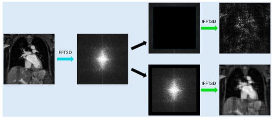 As the field of artificial intelligence has advanced in recent years, deep learning methods have emerged as a robust tool to perform complex computer vision tasks, with many being developed to perform SR for both natural images and medical images [,,,,]. Deep learning methods have made great strides in overcoming the limitations of the basic interpolation methods. However, very limited research has been done for the application of 3D WH MRI [,,]. Furthermore, cardiac MRI presents a unique challenge in that the heart contains anatomy that is both small and complex. The method proposed in this study, the frequency-domain informed SR network (FDoSR-Net), uses the information from the frequency-domain to inform the network during training. It is important to note that within this study it is assumed that only the reconstructed real-valued MR image is accessible, as is usually the case in clinical practice. Thus, the complex-valued frequency-domain cannot be used here. However, it is known that the frequency-domain of the MR image contains valuable information, especially the outer part of the raw k-space data that captures the structural details of the images. Therefore, to enjoy the benefits of the information provided in the frequency-domain, we propose to take the Fourier Transform of the reconstructed real-valued MR images to get the synthetic frequency-domain. We use the word “synthetic” here to distinguish it from the raw k-space. Obtaining the synthetic frequency-domain in this way inverts the information contained therein, such that the center of the synthetic frequency-domain contains information regarding the image detail (Figure 1), and the outer portion of the synthetic frequency-domain contains information relating to the image contrast.