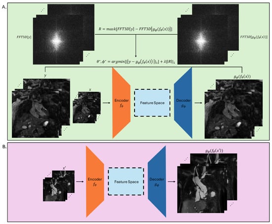 where indicates the 3D Fast Fourier Transform and represents the binary mask function used to select the center frequency-domain information. Respecting the mask, it is applied to zero-out the central portion of the frequency domain, while the data consistency term is in the imaging domain and no mask is applied to it. Furthermore, the mask size was determined heuristically, to minimize contrast information and maximize tissue border information. In this work, 30% of the outer k-space was chosen to be zeroed out. An illustration of this proposed framework can be seen in Figure 2.