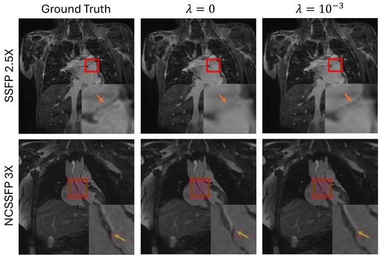 A visual comparison demonstrating the effect of the frequency-domain penalization. The red squares designate the region of interest that indicates clear difference, and the orange arrows indicate the anatomy of interest within the regions that show clear differences.