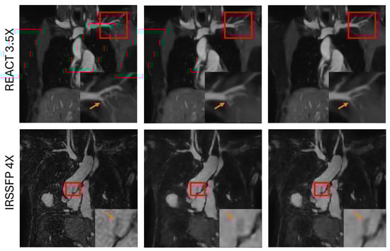 A visual comparison shown in Figure 7 provides a qualitative analysis of the proposed method for 4 SR factors with images obtained from 4 different sequences. The top row of Figure 7 shows images acquired using the REACT sequence and super-resolved by a factor of 2.5. The highlighted portion shows distinct vessels that are close to the ground truth. However, each comparison method merges the vessels together. Pulmonary vessels such as these are examined when evaluating patients for certain heart conditions. Thus, inaccurate depictions of the vessels in Figure 7 could affect the physician’s ability to provide a correct diagnosis. The remaining examples in Figure 7 also show that the FDoSR-Net preserves fine details, whereas these details are either blurred, noisy, or inaccurate in the other methods, when compared to the ground truth images.