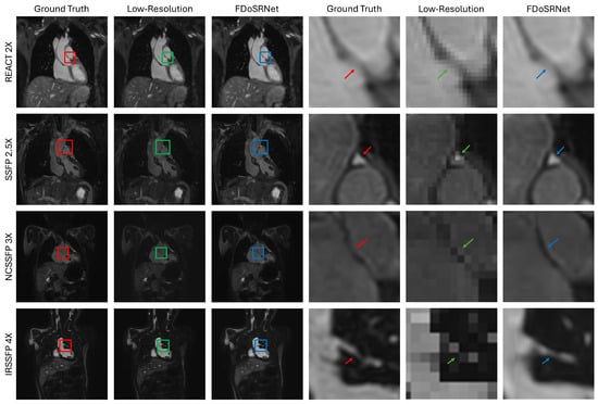 Illustration of the proposed method. Various anatomical details of the high-resolution ground truth, low-resolution images, and output of the FDoSR-Net are compared from each sequence at multiple SR factors. The red box and arrow correspond to the ground truth, the green box and arrow correspond to the low-resolution image, and the blue box and arrow correspond to the output of the FDoSR-Net.