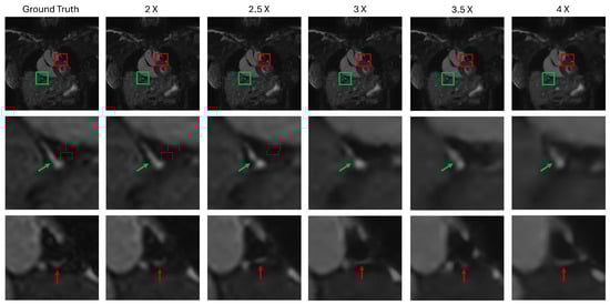 Showcase of the robustness of the FDoSR-Net. A slice of an NCSSFP image is shown, highlighting the preservation of small anatomical detail across multiple SR factors. The green box and arrow highlight tissue between the liver and right atrium and the red box and arrow show show a piece tissue adjacent to the aorta.