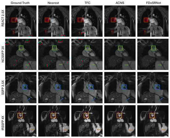 A visual comparison of the proposed method against nearest neighbor interpolation and two state-of-the-art deep learning methods, ACNS [] and TFC []. Slices from each sequence and multiple SR factors are shown, demonstrating the ability of the FDoSR-Net to maintain small anatomical detail compared to other methods. Each colored box and arrow corresponds to the given sequence and SR factor; red = REACT 2.5X, green = NCSSFP 3X, blue = SSFP 3.5X, and orange = IRSSFP 4X.