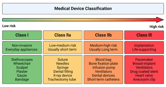 - U.S. Food and Drug Administration. Classify Your Medical Device. 2020. Available online: https://www.fda.gov/medical-devices/overview-device-regulation/classify-your-medical-device (accessed on 30 November 2024).