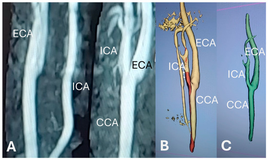 After the vessel segmentation, the data were cleaned out of noise by utilizing the segment editor module, and this was performed carefully, avoiding the deletion of big portions of the areas of interest, such as the common carotid artery (CCA), the internal carotid artery (ICA), and the external carotid artery (ECA) (Figure 1C).