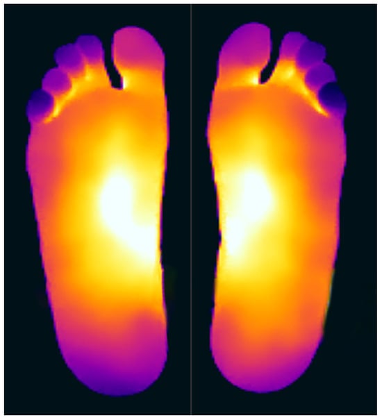 When analysing the thermal distribution patterns of the plantar surface, research consistently highlights distinct differences in these patterns between those belonging to healthy feet and those affected by conditions such as peripheral artery disease (PAD) or diabetic foot ulceration []. Healthy individuals at rest, typically exhibit a ‘symmetric bilateral butterfly’ pattern, characterized by elevated temperatures in the medial arches [,,,]—see Figure 1 for an example. Although this thermal pattern is prevalent in the healthy population and has been observed in approximately half of the cases across studies (56% [],