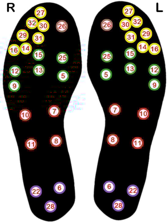 Temperature data were gathered using insoles equipped with 21 embedded thermistors, positioned as illustrated in Figure 2. These temperature sensors communicated wirelessly via Bluetooth, transmitting data to a mobile app at a sampling rate of 0.1 Hz. Both the insoles and mobile app were designed and developed by Tarsos [], as part of an earlier phase of this project. Different insole sizes were used to accommodate different foot sizes.