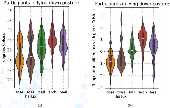 (a) Violin plots of the temperature value distributions of the participants when in a lying down posture with shod feet, grouped by foot region. (b) The distributions of the relative temperature differences after subtracting each participant’s temperature values from their mean foot temperature.