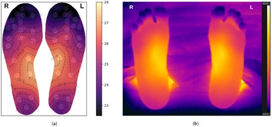 (a) Thermal maps showing the temperature variations (in °C) across the plantar surfaces of the feet, generated from interpolated insole sensor data. Temperature contours are superimposed on the thermal map, while the white circles in the background correspond to the sensors depicted in Figure 2. (b) The corresponding thermogram.