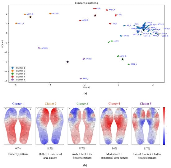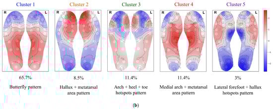 The largest cluster identified by the k-means algorithm (cluster 1 in Figure 5) exhibits the classical butterfly pattern, characterized by the medial arch as the warmest region, as reported in the literature [,,,]. This cluster is also the most concentrated, as shown in the figure. The second-largest cluster (cluster 4 in Figure 5) bears some resemblance to the butterfly pattern, but with the warmest areas extending further up toward the ball of the foot (metatarsal area) and toes. We refer to this thermal pattern as the “medial arch + metatarsal area” pattern. In the thermal pattern of cluster 2, the warmest areas are located at the hallux and the ball of the foot. Clusters 3 and 5 display thermal patterns with multiple hotspots. Cluster 5 shows an elevated temperature along the lateral edges of the forefoot and at the hallux, while cluster 3 exhibits less prominent temperature increase more broadly spread over the arch and heel region, with hotspots at the hallux and the lateral toe area.
