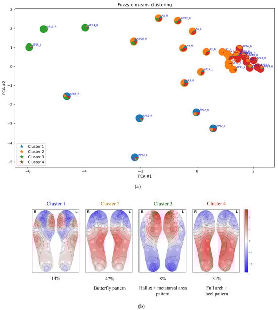 Similarly, the largest cluster from fuzzy c-means (cluster 2 in Figure 6) also represents the classic butterfly pattern. However, fuzzy c-means splits some data points from the butterfly cluster into a separate cluster (cluster 4), which features elevated temperature in the heel region and a broader distribution across the midfoot and heel rather than concentrating solely on the medial arch—hence, we refer to it as the “full arch + heel” pattern. Additionally, cluster 1 of fuzzy c-means corresponds to a combination of clusters 3 and 5 from k-means, while cluster 3 aligns with cluster 2 from k-means. One characteristic of fuzzy c-means clustering is its ability to allow data points to belong to multiple clusters—this fuzzy membership is illustrated in terms of piecharts in Figure 6a. This is useful for analysing patterns that exhibit gradual transitions or overlap between them; for example, clusters 2 and 4 in Figure 6.