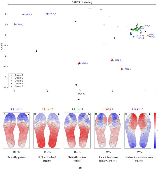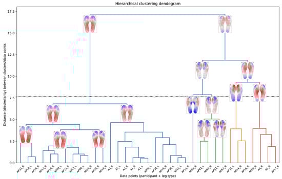 The dendogram also reveals that the butterfly pattern cluster further sub-divides into two related patterns: the classic butterfly pattern, and the “full arch + heel pattern” (observed in cluster 2 of OPTICS and cluster 4 of fuzzy c-means). This indicates that these two clusters share common characteristics in their thermal patterns. Additionally, the dendrogram highlights a variant of the butterfly pattern with a slight hotspot in the toe area, aligning with and explaining the results from the OPTICS algorithm (cluster 3 of Figure 7).