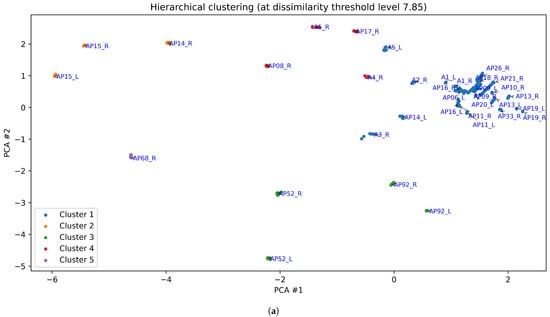 Figure 5, Figure 6, Figure 7, Figure 8 and Figure 9 display the clustering results of the different clustering algorithms used in this study. The first of these figures, Figure 5a, shows a 2D plot of the clustering results of the k-means algorithm. The labels next to the data points indicate the participant identifier followed by the leg type indicator (L/R). Figure 5b shows the thermal maps corresponding to the cluster centroids, the cluster sizes (shown as a percentage of total data points), and the name of the thermal pattern (cluster) as referred to in this study. The thermal maps of the cluster centroids show the relative temperature difference (in °C) from the mean foot temperature (computed as the mean of the 21 sensors of each insole)—red areas in the thermal map indicate an elevated temperature compared to the mean, while blue areas indicate lower temperatures. A similar layout and structure is adopted for the remaining figures, Figure 6, Figure 7, Figure 8 and Figure 9.