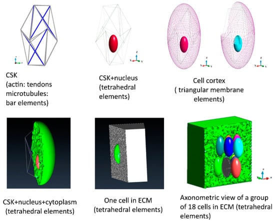 The cell model consists of nucleus, cytoplasm and cytoskeleton []. The current model is extended by employing it in a group of cells embedded in the ECM. The cytoplasm is surrounded by a membrane (cortex). The nucleus and cytoplasm are discretized with tetrahedral finite elements (87,733 and 12,046 elements, respectively). The membranes are modeled using triangular membrane elements (cortex 3236 membranes and nucleus membrane 1792 membranes, Figure 1, upper panel). The cytoskeleton is considered to be a tensegrity structure based on the icosahedron. The deformation of the icosahedral shape is modeled on the observed actual shape of the cell. Prestressed tendons model actin, while the bars model the microtubules. The model consists of six bars and 24 tendons (Figure 1, upper panel).