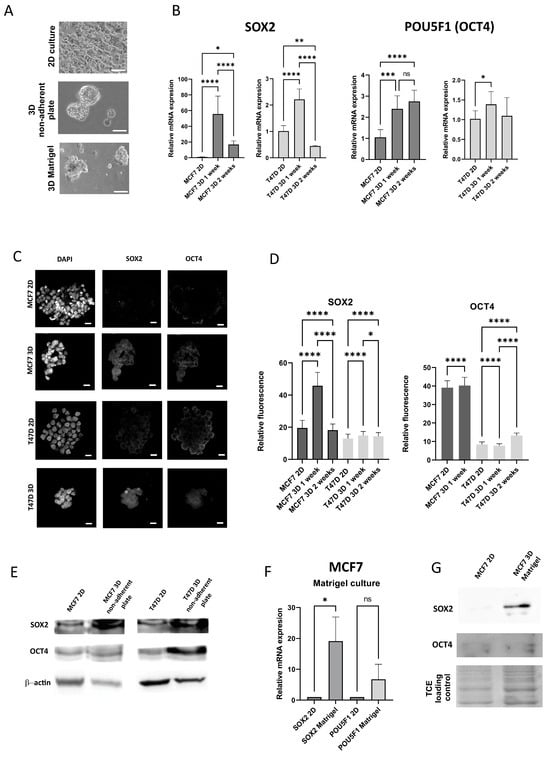 Expression of stem cell markers under 2D and 3D conditions. (A) Representative images of 2D and 3D cultures, MCF7 cells, Olympus CKX53, scale bar 20 μm. (B) qPCR results of SOX2 and POU5F1 expression in 2D and 3D (non-adherent plate) conditions, MCF7 and T47D cell lines, (C) Representative confocal images of the 2D culture and 1-week 3D culture on non-adherent plate. Scale bar: 20 μm (D) Quantification of the fluorescence for SOX2 and OCT4, 2D and 3D on non-adherent plate. (E) Western blots for SOX2 and OCT4, 2D and non-adherent plate, (F) qPCR results for the culture on Matrigel, (G) Western blot results for the culture on Matrigel. p-values: *—<0.05, **—<0.01, ***—<0.001, ****—<0.0001, ns: non-significant.