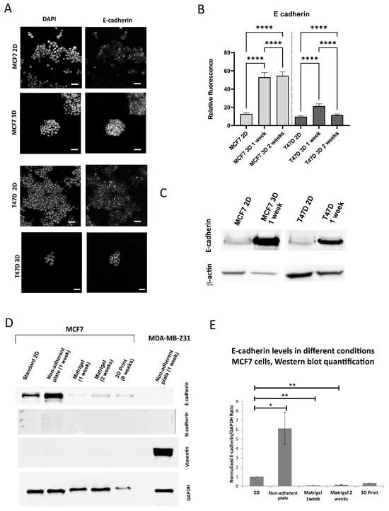 The expression of the most basic EMT markers, CDH1/E-cadherin (epithelial) and VIM/vimentin (mesenchymal), was comparatively analyzed in the standard 2D cultures, 3D culture in non-adherent plate and 3D Matrigel cultures. Additionally, E-cadherin expression was assessed in a 3D bioprinted culture, which technically corresponds to the Matrigel type of scaffolded culture. The results indicate that the expression of E-cadherin increases in the culture on a non-adherent plate (Figure 3A–E) but decreases in a scaffold-based culture (both standard Matrigel culture and long-cultured 3D bioprint sample, Figure 3D,E), compared to standard 2D culture. Vimentin expression in the analyzed epithelial breast cancer cell lines is not present, and both analyzed types of 3D culture do not induce it (for reference, the expression of vimentin is shown in the MDA-MB-231 cell line). The second mesenchymal marker was N-cadherin, also not present and not induced in all tested cell lines (Figure 3D).