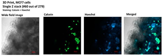 Image of a single Z-stack from a 279, confocal image, bioprinted MCF7 culture, staining: calcein (live cells) Hoechst 33342 (nuclei), Zeiss LSM800 microscope (Carl Zeiss AG, Oberkochen, Germany).