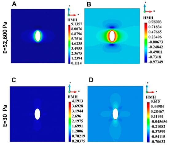 Cell in ECM is interpreted as an inclusion in continuous medium. The maximum HMH stress is close to the top and bottom of the cell (inclusion). In the case of the stiff gel, the region of high stress is concentrated around the entire cell; similar concentration is observed for soft gel, but the stress gradients are milder. To enhance the differences present in the linear scale (Figure 5A,C), a decimal logarithm scale is used (Figure 5B,D). Figure 5 presents HMH stress distribution in ECM around one cell calculated for the stiff (Figure 5A,B) and soft gel (Figure 5C,D). The stress is higher in the case of the stiff ECM than in the case of the soft ECM.