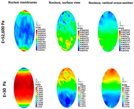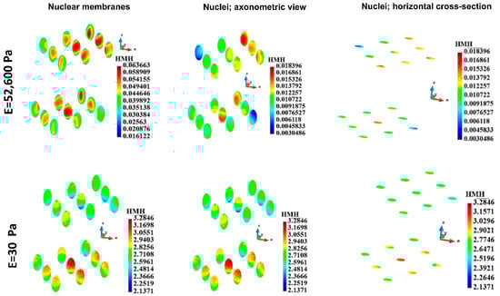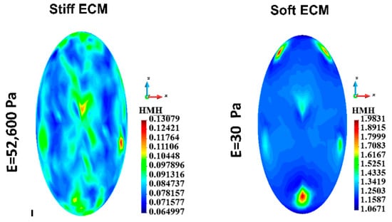 For the group of cells, the HMH stress in the nuclei membranes (Figure 12) is significantly lower in the case of stiff ECM (upper panel) than in the case of soft ECM (lower panel). The distribution of stress in the case of stiff ECM is similar in both layers of the cells. In contrast, in the case of soft ECM, HMH stress is higher in the lower layer of the cells than in the upper one (Figure 12).