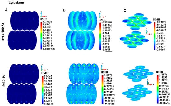 HMH stress, group of cells, cytoplasm. (A) Linear scale, (B) Side view, decimal logarithm scale, (C) Horizontal cross-section, axonometric view, decimal logarithm scale.