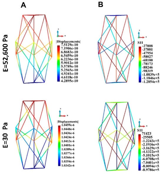 Cytoskeleton, group of cells; displacements and uniaxial stress; upper panel: stiff ECM, lower panel: soft ECM. (A) Displacements, (B) Uniaxial stress. Stiff (upper panel) and soft (lower panel) ECM.