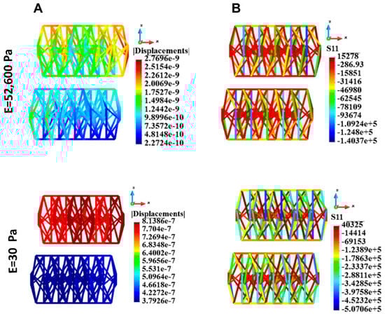 The results of the analysis are the displacement and stress fields. In the results section, the displacement fields are shown. In the case of the cytoskeleton, the uniaxial stress is presented. Then, the Huber–Mises–Hencky (HMH) stress is given showing an effort of the material. The HMH stress reads as follows: