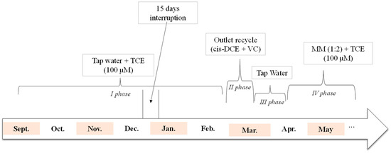 Phase I corresponds to the start-up phase of the reactor and was conducted with a feeding solution consisting of tap water contaminated with TCE at a concentration of 0.1 mM. The overall duration was 165 days, during which 102 mg of TCE daily and a total of about 840 L of water were treated. At the end of this phase, the feeding solution was varied (Phase II) by recirculating the outlet solution from the top of the reactor (composed mainly of VC and, to a lesser extent, cis-DCE) without the addition of TCE. Under these conditions, about 60 L of water was treated in 15 days. Phase III was then performed by feeding the reactor only tap water. This period lasted 16 days and allowed for the treatment of about 70 L of water. In the last part of the experiment (Phase IV), the feeding consisted of mineral medium (MM) contaminated with 0.1 mM TCE. After 30 operative days, 68 mg of TCE per day and a total of about 300 L of water were treated. The theoretical operating conditions are reported in [20], and a schematic representation of the operative timeline is shown in Figure 1. However, the effective flow rate was calculated daily since the intrinsic fluctuations of the adopted pumping system must be considered. The results will therefore show the average values over the investigated period. Similarly, the actual incoming TCE (TCE in) concentration was determined by sampling when changing each feeding solution. The monitoring of CAHs and organic acids started after almost two hydraulic retention times (HRTs) of continuous feeding. On the other hand, the inlet and the outlet were sampled every day, whereas the profiles were performed once a week, both for the determination of CAHs and organic acids.