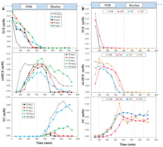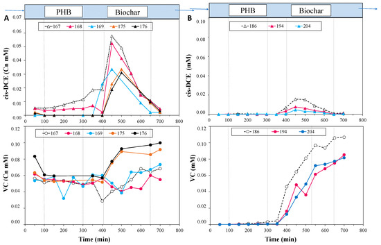 In detail, Figure 2A shows the formation of cis-DCE, from 20 days of operation continuously until the last monitoring profile (160 days), in correspondence with the degradation of TCE in the very first sampling doors, with a peak in the maximum concentration at gate 7 (350 min). Hence, from gate number 8 (400 min), in correspondence with the beginning of the biochar zone, the cis-DCE concentration decreased. On the other hand, the formation of VC began after 20 days and significantly increased after 83 days of operation (Figure 2A). This behavior attests to the presence of dechlorinating culture activity. Moreover, until day 40, cis-DCE and VC were both depleted at gate 11 (after 550 min) thanks to the combined effect of BRD and adsorption on the biochar. However, after 83 days of operation, cis-DCE and VC were detected within the effluent, indicating that these intermediates had partially broken through the biochar. Indeed, from the cis-DCE profile at 83 days (Figure 2A), it is possible to highlight an increased concentration in the biochar zone (from gates 8 to 14), suggesting the reaching of the adsorption equilibrium of cis-DCE within the biochar. Then, after 100 days, the cis-DCE concentration significantly decreased. Therefore, the VC concentration increased with an opposite trend to that of the cis-DCE, reaching an average value of 0.08 ± 0.02 mM in the effluent. In this regard, it is noteworthy to underline the quantitative reduction of 0.1 mM of TCE fed to VC (Figure S2 shows TCE and its daughter products’ concentration in the effluent during the whole operative time, and after 100 days, the VC concentration settled at 0.08 ± 0.02 mM). As reported in Figure S2, during the last month of operation, VC was found in the effluent because of the combined effects of adsorption and biodegradation. However, ethylene, the final product of TCE reduction, was not detected either inside the reactor or in the effluent. As shown in Figure 4, only Dhc strains carrying tceA genes, which are known for the metabolic reduction of TCE to cis-DCE and VC and the co-metabolic reduction of VC to ethylene [28], were detected. In contrast, bvcA and vcrA genes were present at concentrations below 1 × 102 gene copies/L (data not reported in the figure). These findings suggest that the residence time (1.8 days [20]) may have interfered with the dechlorination capabilities of the Dhc tceA-carrying strains, preventing the completion of the rate-limiting VC reductive dechlorination step. Additionally, it also may indicate a loss of selective pressure within the reactor for the vcrA- or bvcA-carrying strains capable of metabolic cis-DCE or VC dechlorination to ethylene, which were originally present in the inoculum [20]. This hypothesis was supported by microcosm studies conducted at the conclusion of the column reactor’s operation (see below).
