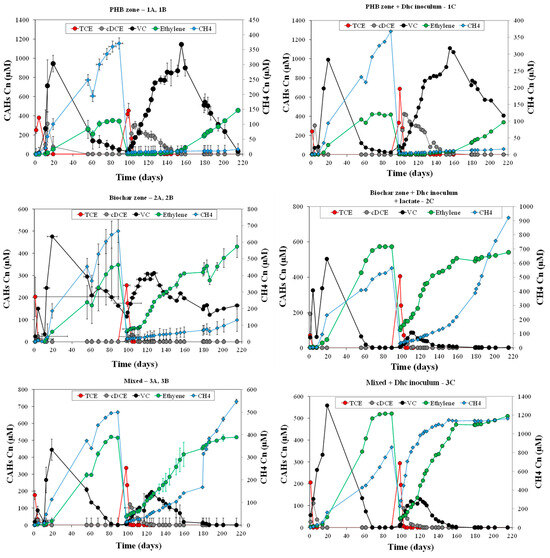 The complete reductive dechlorination of TCE to ethylene was observed under all tested conditions using materials collected from the following: (i) the fermentative zone filled with PHB (microcosms 1A and 1B) and further bioaugmented with the Dhc inoculum (microcosm 1C); (ii) the biochar zone (microcosms 2A and 2B) and further biostimulated with lactate and bioaugmented with the Dhc inoculum (microcosm 2C); and (iii) a mixture of both the PHB and biochar zones (microcosms 3A and 3B), further bioaugmented with the Dhc inoculum (microcosm 3C) (Figure 5).