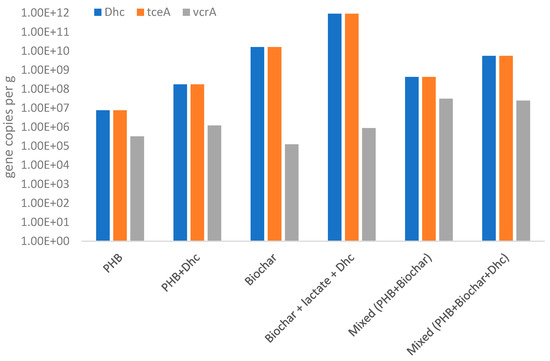 The last operative days (Phase IV) were then conducted by feeding the reactor with mineral medium contaminated with 0.1 mM TCE, in order to stimulate the biological response by supplying important nutrients (i.e., vitamins and metals) needed for biomass growth and metabolism. As shown in Figure 2B, the TCE concentration already decreased at gate 2 in the fermentative zone, with the consequent formation of cis-DCE and its complete depletion at the beginning of the biochar zone. Then, the VC concentration started increasing in the first part of the column, stabilizing at values ranging between 0.05 and 0.1 mM from gate 7 to 14 (in the effluent). These behaviors can be explained by the ability of Dhc biomass to rapidly respond to varying inputs (i.e., changes in feeding) and to the possibility that dechlorinating species may migrate to the fermentative zone, where electron donors are more readily available. As shown in Figure 4, at the end of Phase IV, the Dhc abundance increased by approximately one order of magnitude in both the PHB and biochar zones. This increase also included a corresponding rise in tceA and vcrA gene abundances. These findings further support the stimulating effect of the optimal conditions (e.g., the presence of additional nutrients in the medium) on the dechlorinating community within the column system, which had been progressively established over time under the various operational conditions tested.
