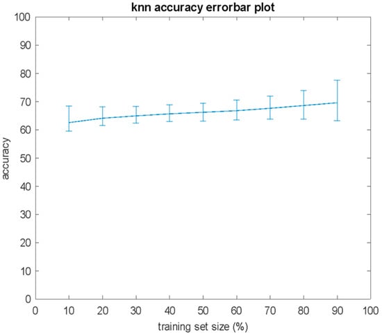 Numerous independent computer experiments were conducted for various values of the free parameter K of the KNN algorithm. In total, 100,000 independent experiments were conducted, and the mean value, the standard deviation, the minimum vale, and the maximum value of the classification performance, in terms of accuracy, according to (Equation (1)), were estimated for the size of the training set S in the range from 10% to 90%, with an increase step 10%. The obtained results for K = 3 are presented in Figure 1 and Figure 2. In Figure 1, in the form of an error bar plot, the averaged classification performance and standard deviation over 100,000 independent computer experiments are shown, in which v is the size S of the training set. As can be observed in Figure 1, the mean value of classification accuracy shows a slight increasing trend as the size of the training set increases. In Figure 2, there the average (red), maximum (green), and minimum (blue) classification performance of the 100,000 independent computer experiments are shown, with respect to the size S of the training set. As shown in Figure 2, there training sets with size 80% or 90% of N were found, which achieved 100% classification accuracy on the test set. To be more specific, for S = 0.8 N, four combinations of the training set that achieved accuracy = 100% were found, whereas the corresponding result for S = 0.9 N was that 921 combinations achieved accuracy = 100%. An additional point that can be seen in Figure 2 is that the deviation between the maximum and minimum values of the classification accuracy widened significantly as the size of the training set increased.