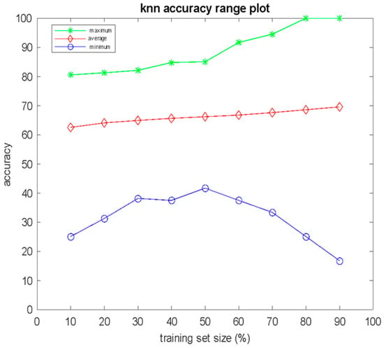 Mean value, maximum value, and minimum value of classification accuracy versus the percentage of the training set size for 100,000 independent computer experiments of KNN, and K = 3.