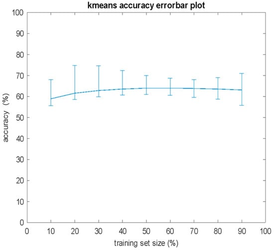 As in the case of the KNN, 100,000 independent experiments were conducted for the K-means algorithm, with training set sizes ranging from 10% to 90% of the total cases N, with a step size of 10% increase. With respect to the size S of the training set, in Figure 3, the the error bar plots of the mean value and the standard deviation are presented, whereas in Figure 4, the mean, maximum, and minimum values of performance on the test set are presented. The K-means algorithm achieved 100% accuracy in 265 experiments, all for S = 0.9 N. By combining the findings presented in Figure 3 and Figure 4, it can be seen that despite the fact that the mean performance remained almost unaffected by the size S of the training set, the deviations between the minimum and maximum values of the classification performance increased as S increased.