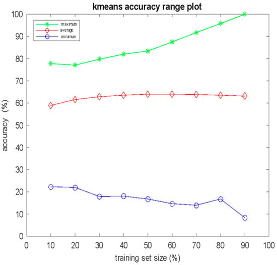 Mean value, maximum value, and minimum value of classification accuracy versus the percentage of the training set size for 100,000 independent computer experiments of K-means algorithm.