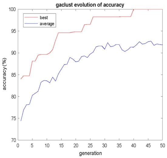 Indicative results for a GA population of just 20 individuals that had evolved for 50 generations are as follows. The evolution of the mean fitness of each generation and the corresponding evolution of the best fitness of each generation are shown in Figure 5, where it is shown that the GAClust algorithm very rapidly converged to 100% accuracy. For the fittest individual of the last (50th) generation, the training set was constructed of S = 64 cases, as shown in Table 2. The 64 cases of Table 2 correspond to 53.33% of the total size of the dataset, and it is considerably smaller than 70% that is usually used ML training procedure.
