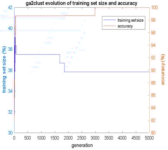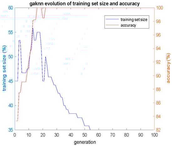 In computer experiments of the GAKNN, the GA population of 100 individuals had evolved for 100 generations. K was set equal to 3 and the alpha weight factor in (Equation (5)) was set to 0.28. Given that the GA is a two-objective one searching simultaneously for the smallest size of the training set and the maximum classification performance, according to (Equation (5)), in Figure 6, the evolution of the training set size S of the fittest individual of each generation (blue line with respect to the blue right y-axis of the plot) are shown, as well as the corresponding classification accuracy acc of that individual (red line with respect to the red left y-axis of the plot). Figure 6 clearly illustrates the simultaneous increase in classification accuracy and the decrease in size S of the training set as the GA population evolves. The GAKNN converged to a training set that was consisted of 42 cases (42/120 = 35% of the total available data); therefore, the test set was consisted of the rest 78 cases (78/120 = 65%). The 42 cases that constructed the optimal training set for the GAKNN are shown in Table 3.