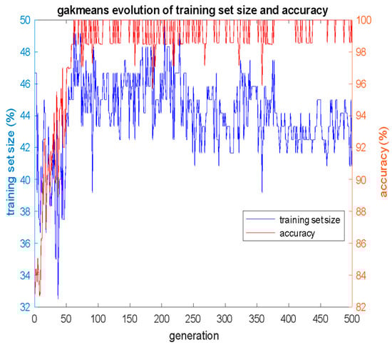 The corresponding results obtained by the GAKmeans algorithm are presented in the same manner, in Figure 7 and Table 4. The alpha weight factor in Equation (5) was set to 0.5. The GAKmeans evolved a population of 100 individuals for 500 generations and converged to classification accuracy 100% with the use of just 50 cases in the training set, that is, S corresponds to 50/120 = 41.67% of the total size of the available data, which is considerably smaller than 70% that is usually used in ML experiments. The 50 cases that constructed the optimal training set for the GAKmeans algorithm are shown in Table 4.