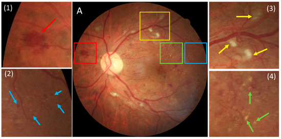 A color fundus photography (CFP) example illustrating the appearance of a hemorrhage, microaneurysm, soft exudate, and hard exudate. (A) shows the original image with boxed regions, while (1)–(4) present enlarged views. In (1), a red arrow indicates a hemorrhage, corresponding to the red box in (A). In (2), a blue arrow marks a microaneurysm from the blue box in (A). In (3), a yellow arrow points to a soft exudate from the yellow box in (A). In (4), a green arrow highlights a hard exudate from the green box in (A).