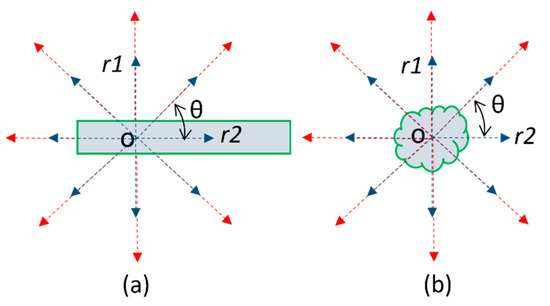 Illustration of multiscale contrast shape descriptor: (a) Linear structure and (b) blob-like structure. The different colors of the arrows represent varying distances of the line segments.