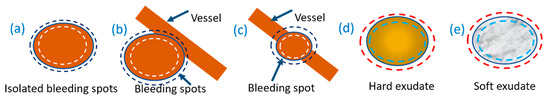 An illustration of the underlying idea of the boundary contrast for characterizing bleeding and exudate spots. (a) shows an isolated bleeding spot, (b) shows a bleeding spot slightly attached to a vessel. (c) shows a bleeding spot fused with a vessel. (d) shows a hard exudate that has a progressive density change from the center to the boundary. (e) shows a soft exudate that has an uneven density distribution. For a blob-like spot, both inner and outer rings as dashed lines are computed using EDT. The contrast between inner and outer rings is used to differentiate exudates and bleeding spots and quantify their confidence level.