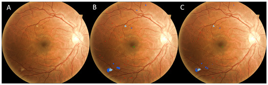 Another example demonstrating the models’ performance, successfully identifying tiny lesions of various types. (A) Original image, (B) manual result, (C) computer result. (Dark blue: hemorrhage, red: microaneurysm, green: hard exudate, light blue: soft exudate).