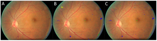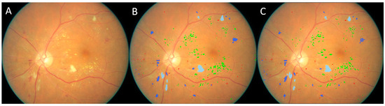 Another example showing the models’ results. (A) Original image, (B) manual result, (C) computer result. Blue: bleeding spot, green: hard exudate, yellow: soft exudate.