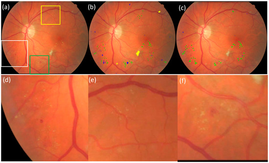 An example showing the performance of the U-Net models on the E-Ophtha dataset. (a) The original CFP image, (b) the computerized result by the U-Net models developed in this study, (c) the manual results, and (d–f) the local enlargement of the regions indicated by the boxes in white, yellow, and green, respectively. The manual annotation in (b) missed many lesions shown in (d–f) but they were detected by the developed models. The spots in green in (b,c) indicate the exudate. The spots in blue in (b,c) indicate the bleeding spots (including microaneurysm).