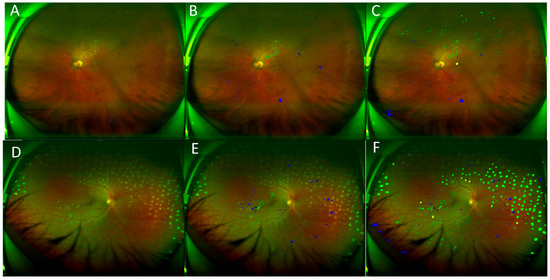 Examples with many false positive bleeding and exudate detections on UWF images. (A,D) Original image, (B,E) manual result, (C,F) computer result. Blue: bleeding spot, green: exudate.
