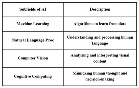 AI-powered robotic systems have revolutionized healthcare systems by assisting surgeons in invasive surgeries and minimizing complications. Moreover, AI-driven prosthetics and exoskeletons can assist patients with spinal cord injuries in walking and executing less extensive movements. These rehabilitation robots can improve their functionality by learning and adapting to the user’s movements, which can provide personalized rehabilitation solutions [19,20]. Subfields of AI have been summarized in Figure 2.